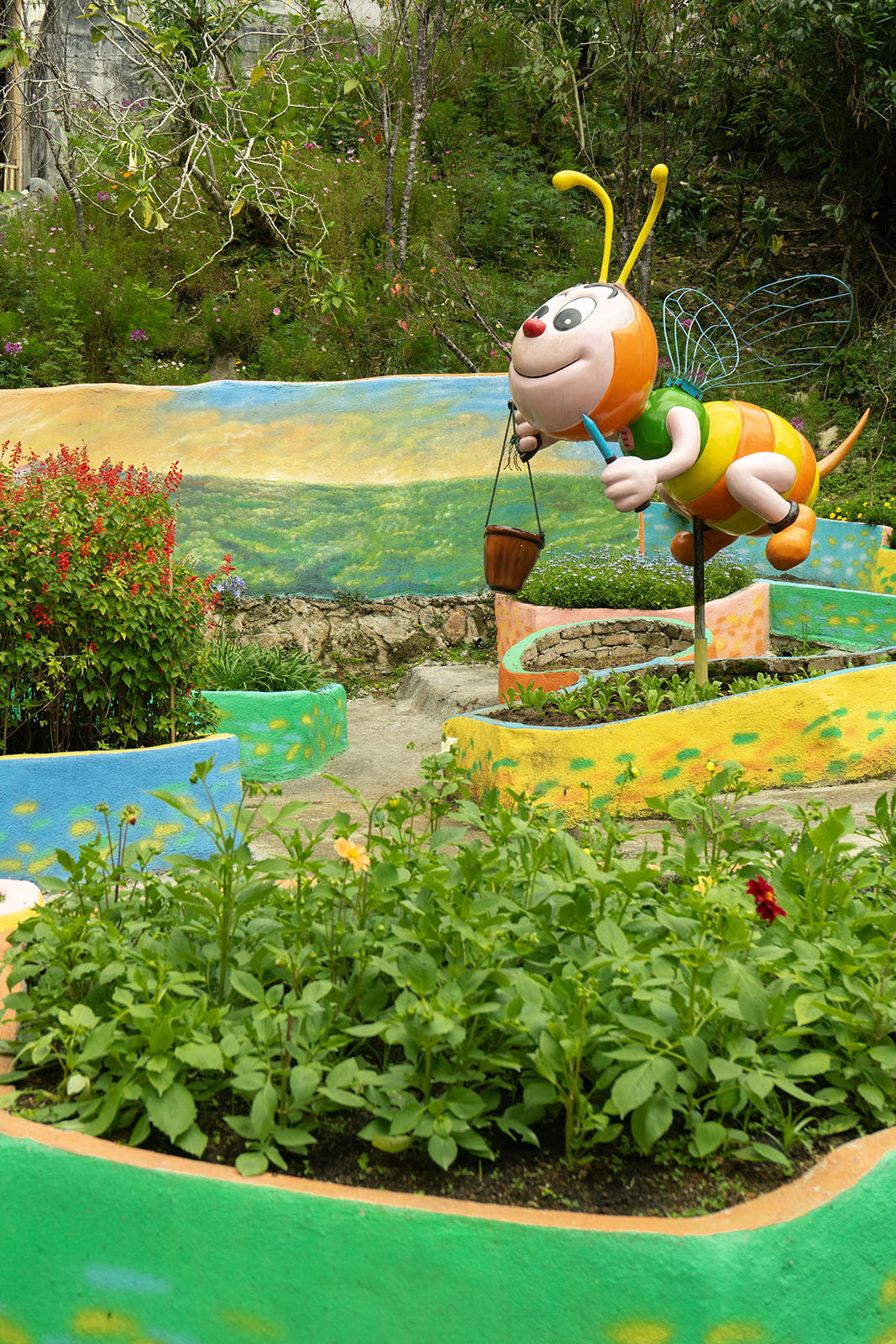 Unas escaleras conducen a diferentes niveles del jardín con paseos entre flores, esculturas y vivos murales. También hay un mirador en lo alto de la colina con vistas magníficas al valle.