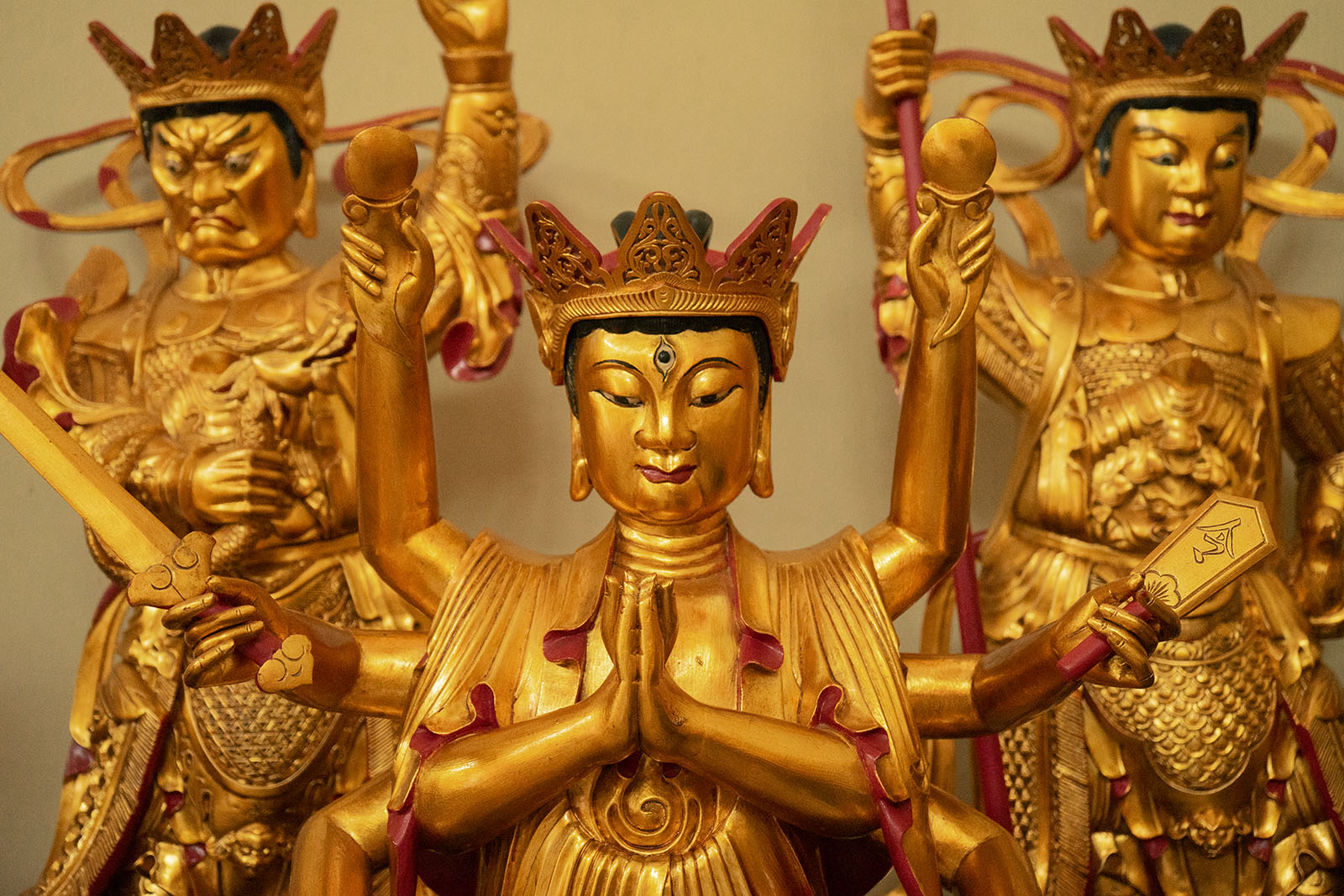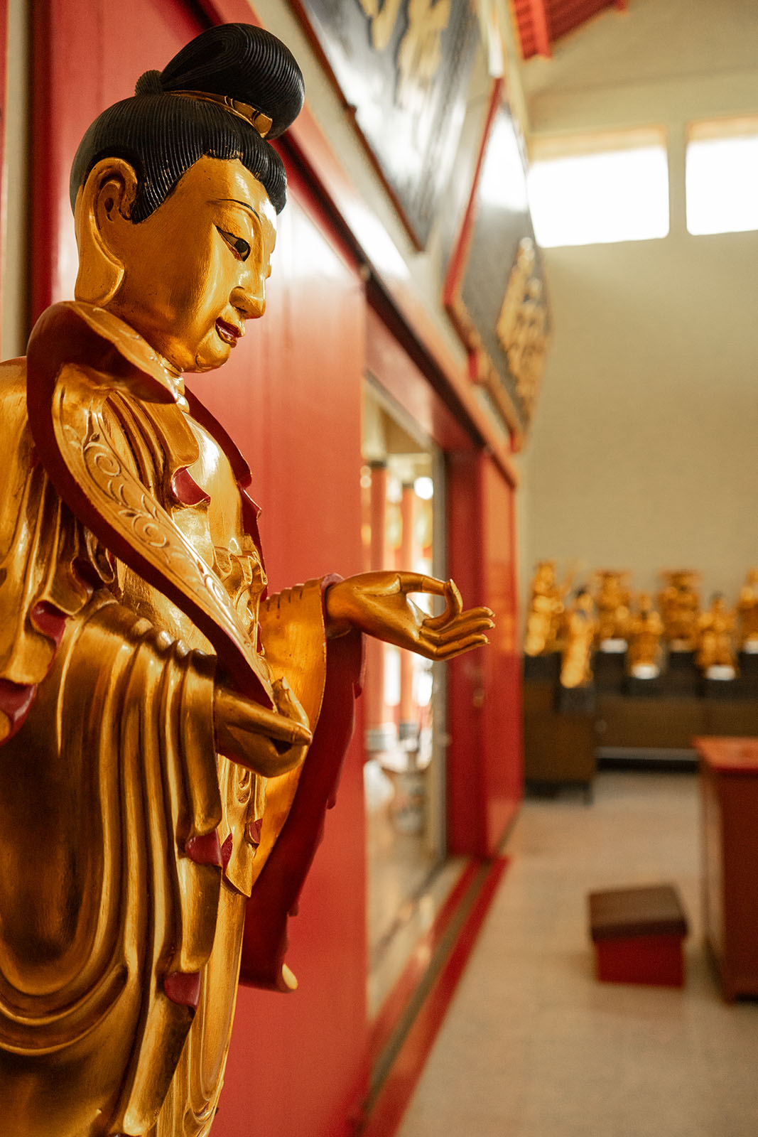 En el interior se abre una gran sala central con un Buda dorado de grandes proporciones mientras que en los pasillos van surgiendo pequeñas salas ocupadas por numerosas esculturas budistas.