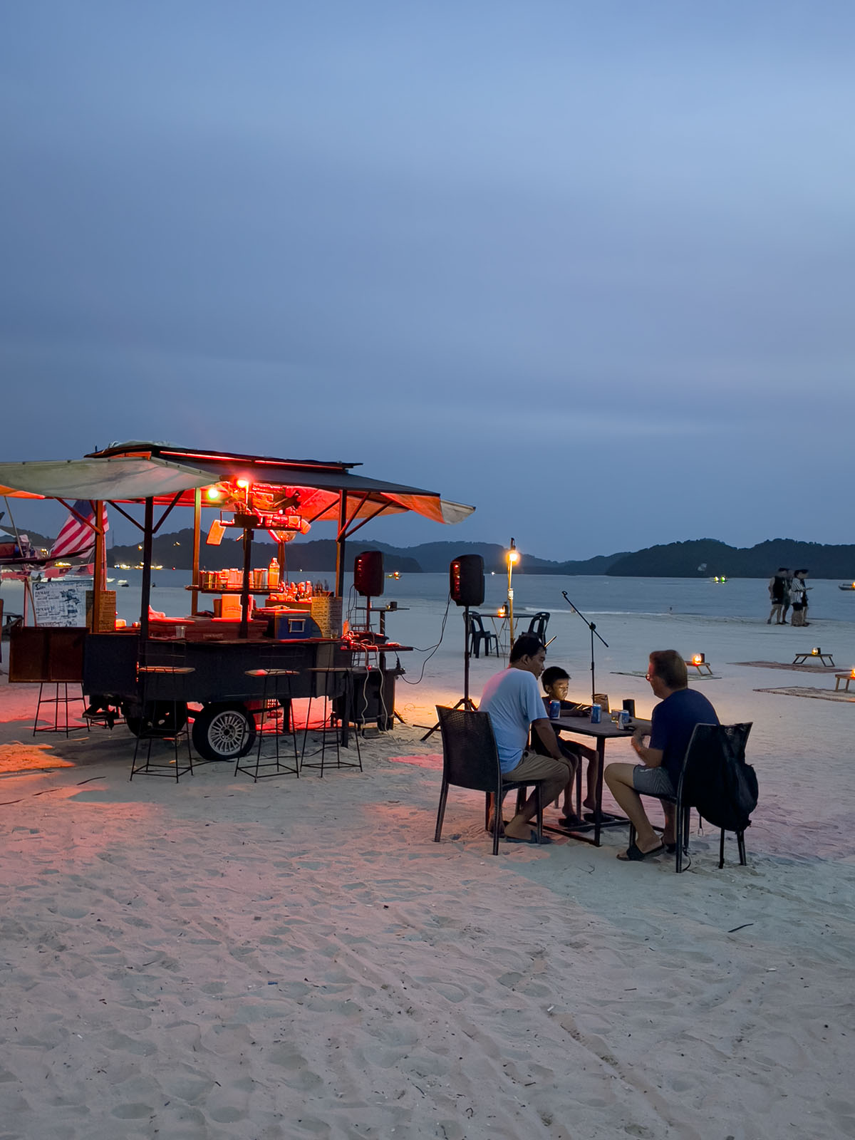 A mediodía suele haber poco movimiento porque los turistas salen a explorar la isla pero conforme cae la tarde Pantai Cenang empieza a coger ambiente, tanto en los chiringuitos a pie de playa como en el paseo lleno de tiendas y cafeterías.